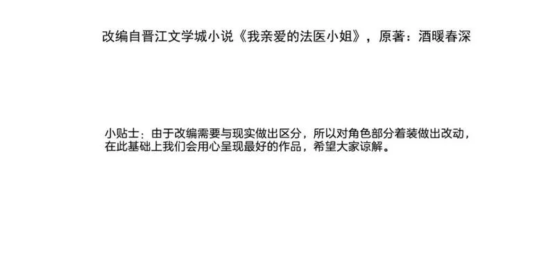 我亲爱的法医小姐又名,类型为恋爱|悬疑|都市的高人气漫画,漫画简介:“冷艳骄恣女法医”林厌遇上“正直藏锋女刑警”宋余杭,从水火不容到相遇相知,一路见证了众多小人物的人生:努力生活却无辜枉死的少女、在深山等待罪犯儿子归来的老母亲、虽然胆小却舍身面对持枪匪徒的小警察......
