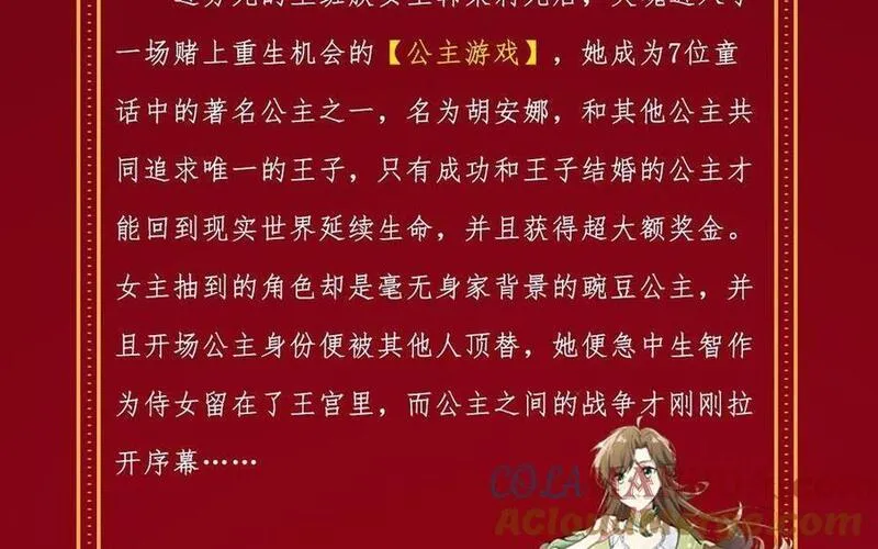 【逢周日更新】女主死后,灵魂竟然进入了一场赌上生命的【公主游戏】!她将成为童话中的著名的豌豆公主和其他公主们共同追求唯一的一位王子。只有成功和王子结婚的公主才能回到现实世界延续生命,并且获得超大额奖金!她该如何斗过强大的公主们俘获王子的芳心呢?!【责编:CC】